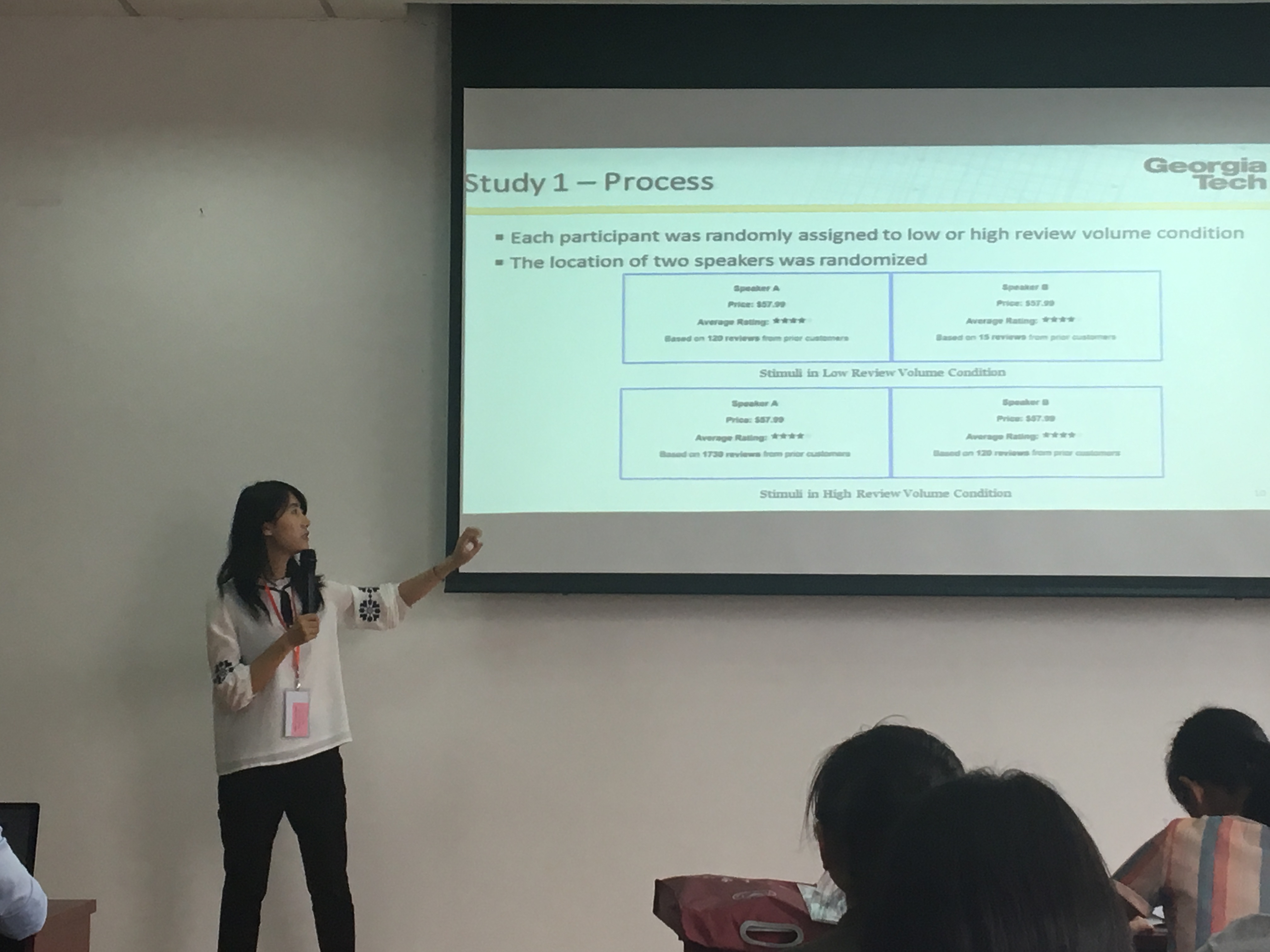 佐治亚理工大学Scheller商学院博士ZhanFei Lei博士作了题为“Why Do Consumers Seek Online Reviews: An Experimental Investigation”的报告,雷绽菲博士主要研究的问题是消费者热衷于在线评论的原因,其通过提出两个假设,假设1是降低不确定性,假设2是提高效率,并分别进行实验设计、实验过程、实验结果及结论和局限来论证假设 ,其研究成果无论从理论角度还是实践角度都产生了深远的意义。