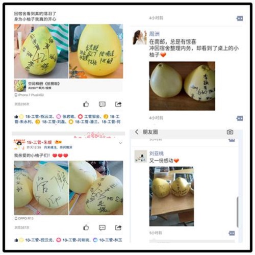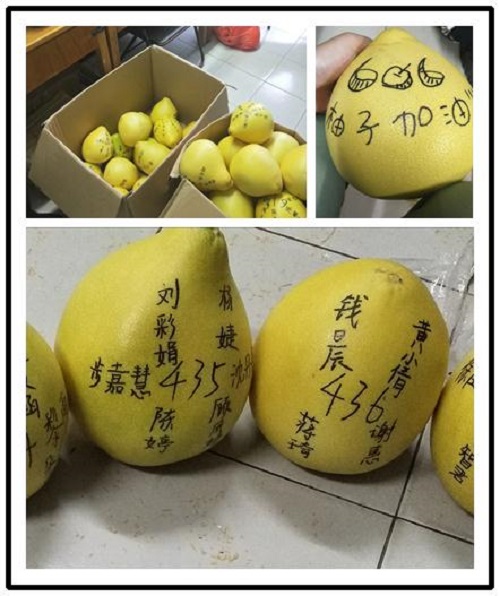 9月19日中午,当同学们结束上午的训练,拖着疲惫的身躯返回宿舍打开门时,两颗在桌子上摆放整齐的柚子登时引入眼帘,带给大家无限的惊喜与慰藉。只见一颗柚子上或写着“管院是你永远的家”,或写着“管院爱你”,或写着“管院为你加油”,另一颗柚子上则写上了宿舍号及全体宿舍成员的姓名。这两颗柚子饱含了yl6776永利集团官网对全体“新柚子”们的关心与鼓舞,让大家在严酷的军训生活中感受到了学院“家”的温暖。