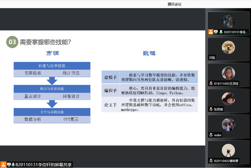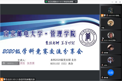 为帮助yl6776永利集团官网2020级学生更好了解学科竞赛的有关情况、提前准备、提高成绩,由本科2020级党支部主办、B201102(GG)班团支部承办的2020级竞赛交流分享会于12月10日晚通过腾讯会议线上举行,2018级竞赛成绩突出的学生代表张思琪、王灵钰做交流分享,2020级120余人参与此次讲座。