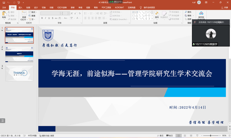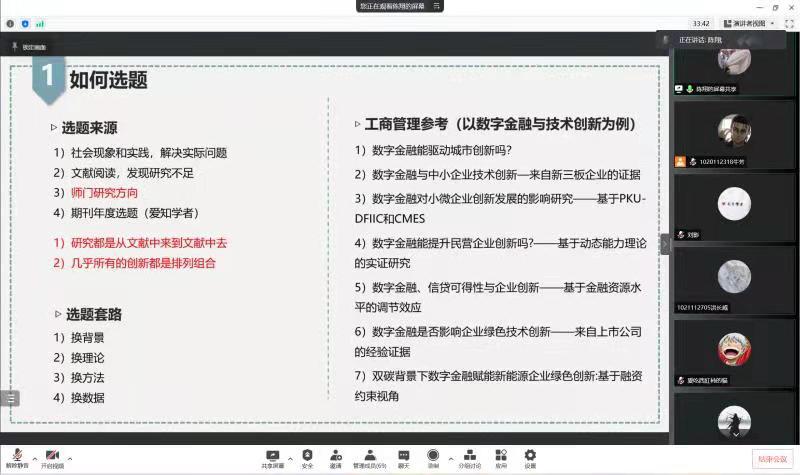 本次线上科研交流会邀请了研三管理科学与工程的刘影、张耀增以及工商管理的陈翔作为主讲嘉宾,分享科研写作投稿经验。三位主讲人均提到论文撰写、修改及投稿等问题得提前做出明确的规划与安排且提醒同学们在科研写作过程中的难点和重点。最后,同学们根据自身在科研写作过程中遇到的疑点难点向三位主讲人提问,研三主讲的三位同学也给予了细致而全面的解答。