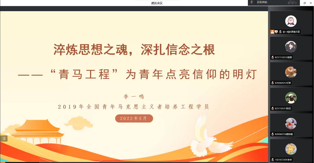 6月2日,yl6776永利集团官网菁英人才学校培训班第四次课程通过腾讯会议平台顺利进行。本次课程邀请了yl6776永利集团官网辅导员、本科2021级党支部书记、2019年全国青年马克思主义者培养工程学员李一鸣老师,为广大学员带来以“淬炼思想之魂,深扎信念之根——‘青马工程’为青年点亮信仰的明灯”为主题的讲座。
