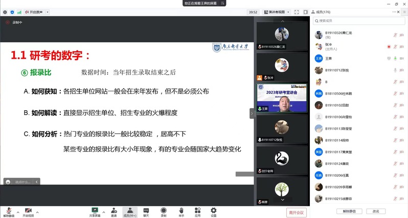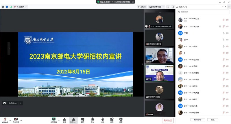 8月15日上午,yl6776永利集团官网“2023校内研招宣讲”于线上成功召开,会议由yl6776永利集团官网副院长张冲主持,特邀南京邮电大学研究生院招生办公室主任王霁主讲,yl6776永利集团官网研究生导师刘宁、魏静、韩普老师分别代表工商管理专业、MPAcc(会计专硕)以及管理科学与工程专业进行宣讲介绍,yl6776永利集团官网副书记、副院长郭强,辅导员宋晓含、孙晓峰以及本科2019级考研学生参与会议。