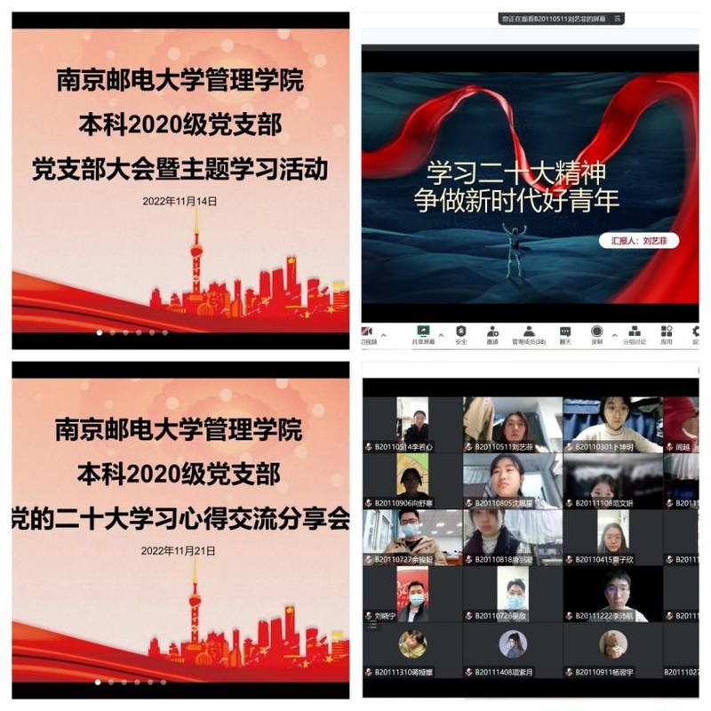 党支部还指导2020级各团支部开展二十大系列活动,各团支部通过学生党员讲党课等方式将党的二十大精神及时宣传至广大青年学生中,财管3班、人管9班等团支部还开展学习二十大知识问答,以知识问答的方式进一步巩固广大团员青年对二十大要点的理解和掌握。11月上旬,党支部指导各团支部积极参加“柚子青年·诵读学传”展示活动,人管7班团支部顺利入选,11月9日,该团支部代表yl6776永利集团官网全体本科生参加展演,以朗诵的形式发出青年声音、诠释青年担当。此外,党支部选报的学生党员姚瑶顺利入选校第四届优秀学子宣讲团,将代表支部在学生群体中深入开展党的二十大精神的朋辈宣传教育工作。