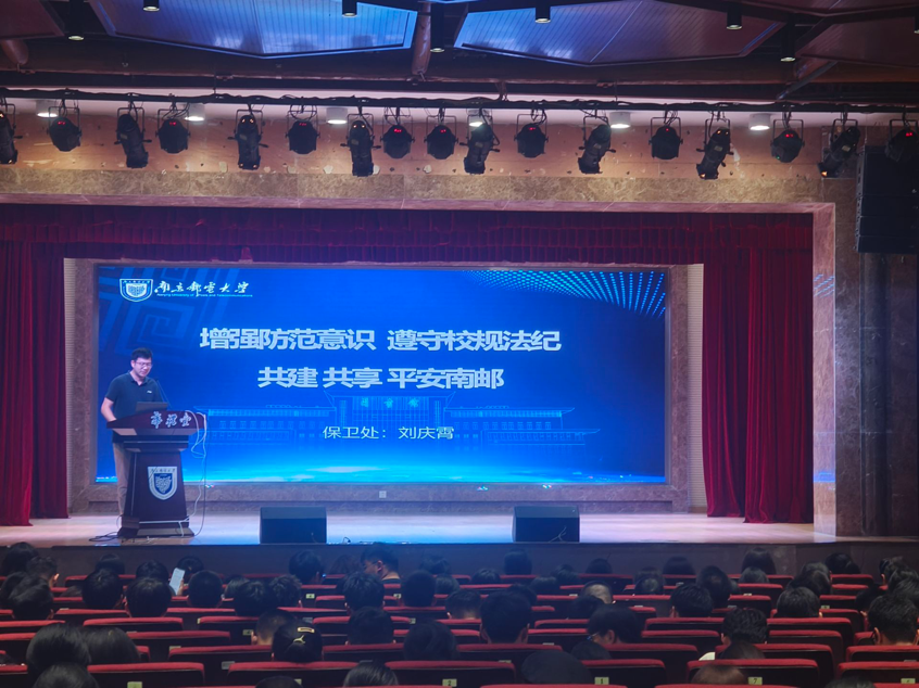 最后,保卫处刘庆霄老师带来“共建·共享·平安南邮”主题分享。他结合近期高发的“校园贷”“刷单诈骗”“冒充熟人借钱”等案例,拆解诈骗分子的套路:“这些骗局往往抓住大家‘贪小便宜’‘怕麻烦’的心理”。随后他科普遭遇诈骗后的应对方法,指导学生第一时间保留证据、联系保卫处及报警,切实提升新生防范意识与应对能力。