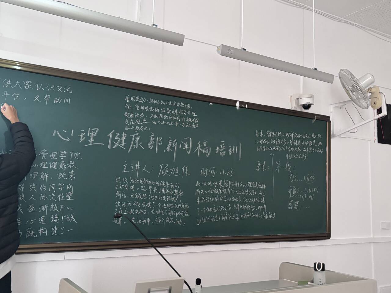 在实操环节,为了让理论落地,需要部员根据优秀新闻稿段落和刚刚总结的框架,对初稿进行修改。各位部员摩拳擦掌、跃跃欲试,更有三位部员主动到黑板上展示他们的想法。学姐穿梭于座位间,耐心解答,提供优化建议。整个氛围轻松愉快,部员们纷纷将修改稿给学姐检查。顾旭佳学姐对部员们的投入与成长提供高度肯定。强调新闻稿写作不仅是技能,更应当以文字承载活动的温度与意义,传递每一份用心。